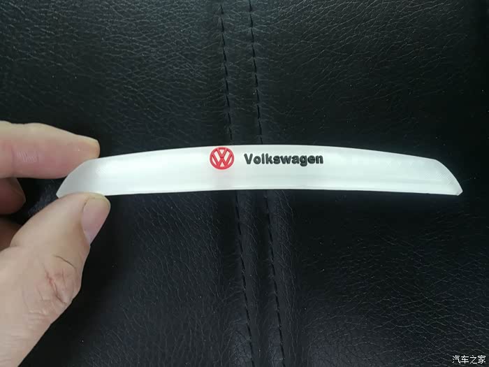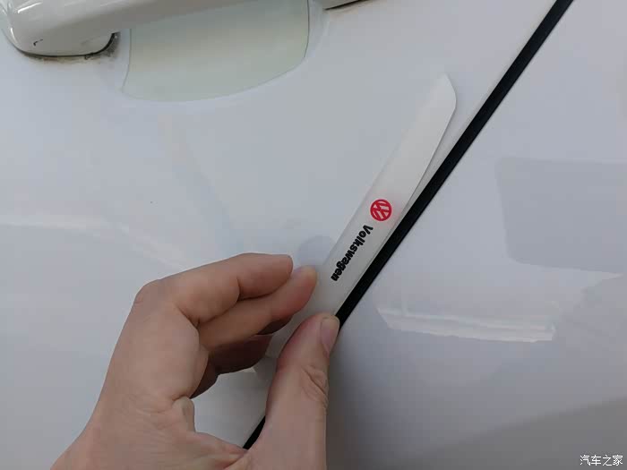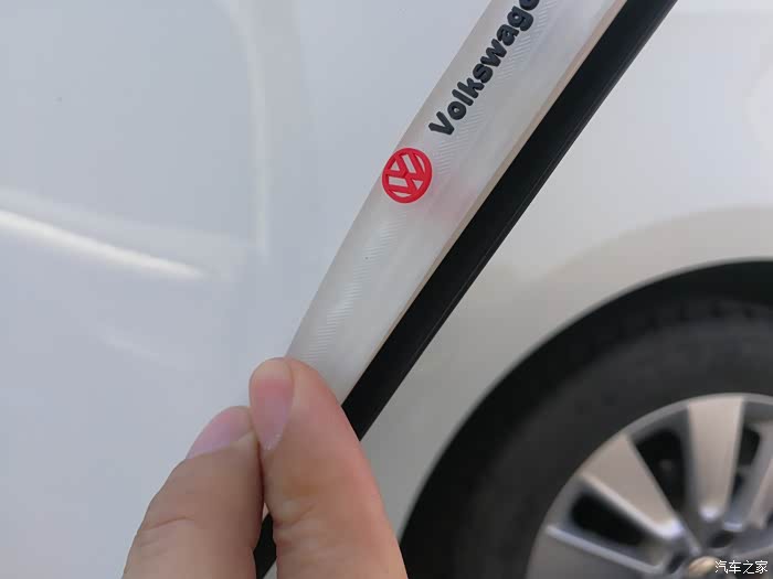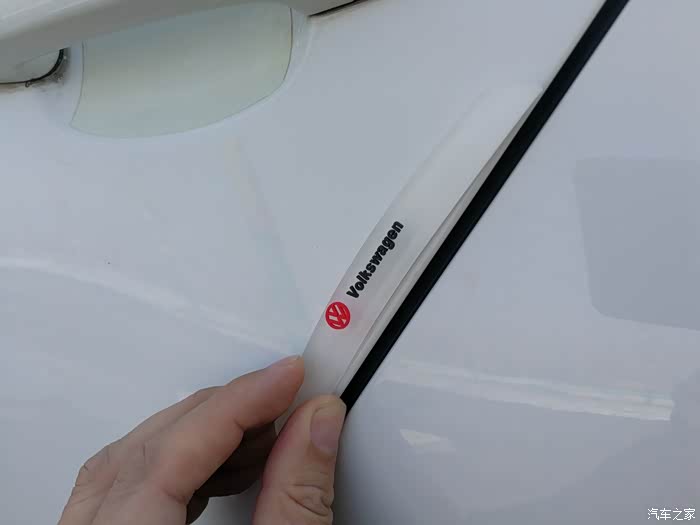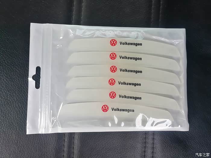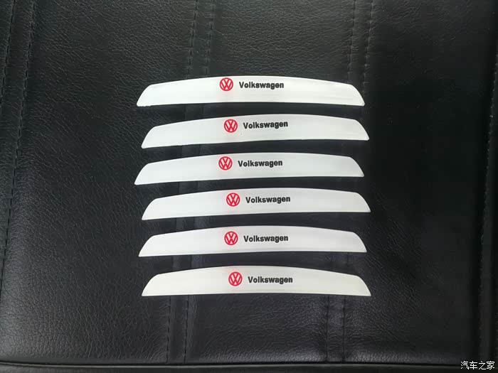 拿出网上购买的车门防撞条6个。除了4个车门之外,还有2个是后视镜防撞条。防撞条是透明色防撞条。防撞条正面有红色的大众标志和黑色的“Volkswagen”标志,非常的美观。
