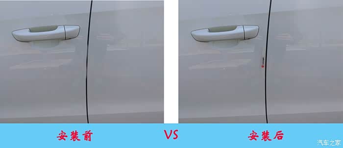 这是安装防撞条前后对比,车门边上虽然有了这一小块不起眼的防撞条,但是它既能起到美观的作用,也能避免开车门时划伤车漆。安装后的效果还算不错吧。
