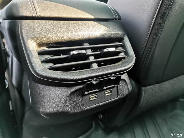 后排空调出风口很强劲,也可以调节出风的大小,下面是两个充电口,带小盖子,可以避免落灰。