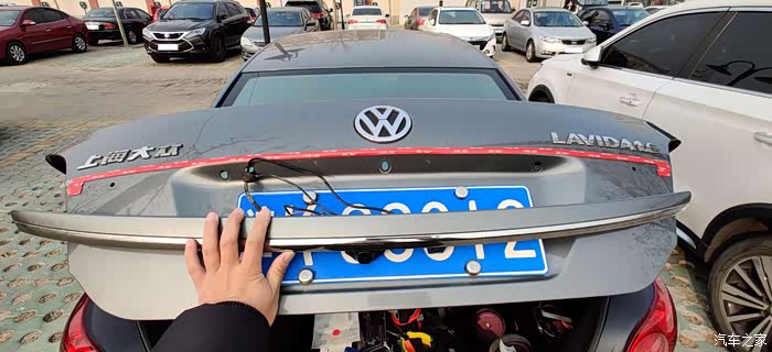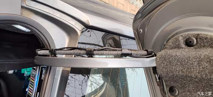 再放一张整体的。走线是从原来装倒车后摄的地方掰了一个洞,把摄像头线穿进去,再从原车预留的孔进入车内。摄像头用双面胶固定在亮条中间的位置上