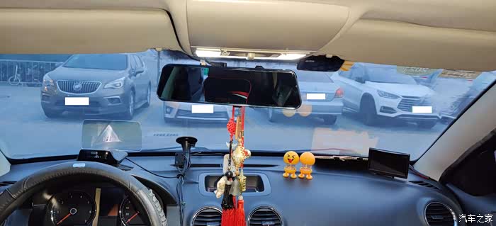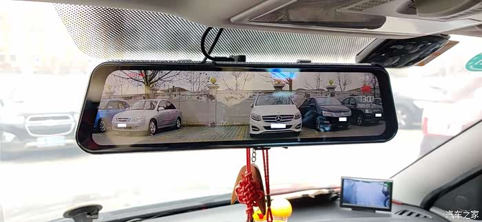 电源线就用的自带的,没有像上次给唐安装的时候那样额外买USB线。这是整体安装效果,走线有点乱,为了照顾抬头显示取电也只能这样了,以前一个吸盘支架固定太结实了拿不下来,正好用来绑线。屏幕不亮的时候就是个普通的后视镜,效果也还行