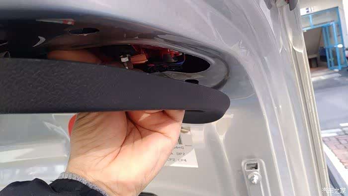 这之后需要我们将后备箱翻盖的面板拆卸掉,首先将固定的螺丝拆解掉。里面那个小圆形盖子打开,有螺丝固定的。(重要的事儿,说三遍。 是小圆形盖子、小圆形盖子、小圆形盖子)