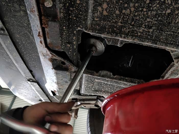 专业技师正在给小六准备更换机油了,首先放掉原有的旧机油。
