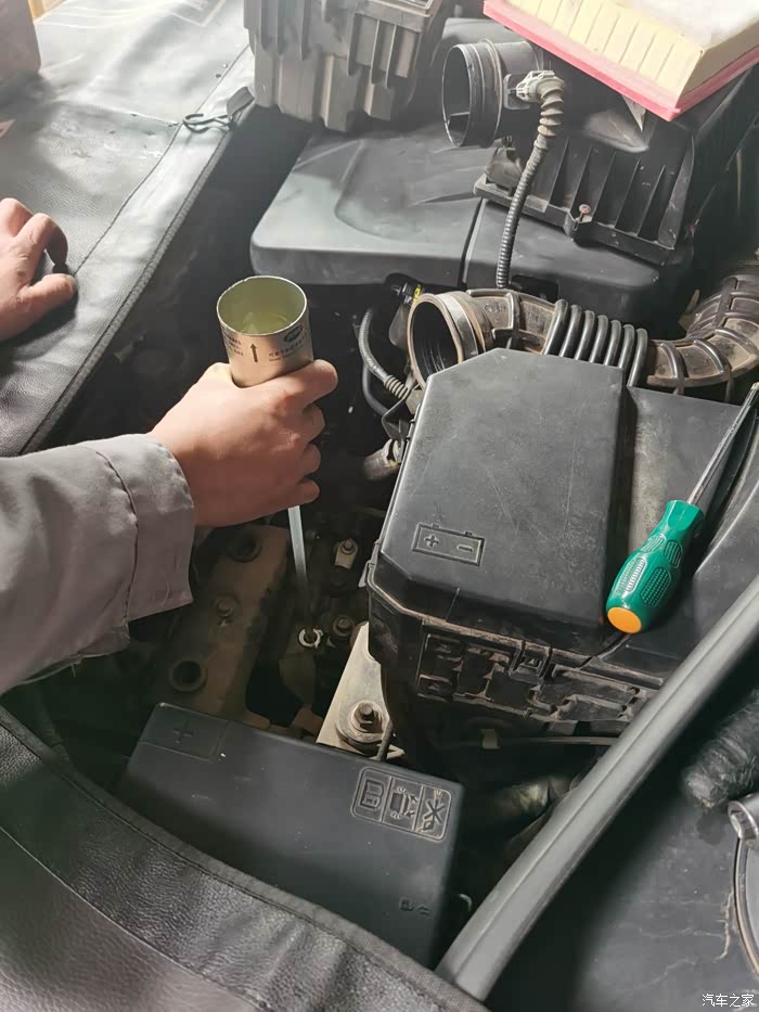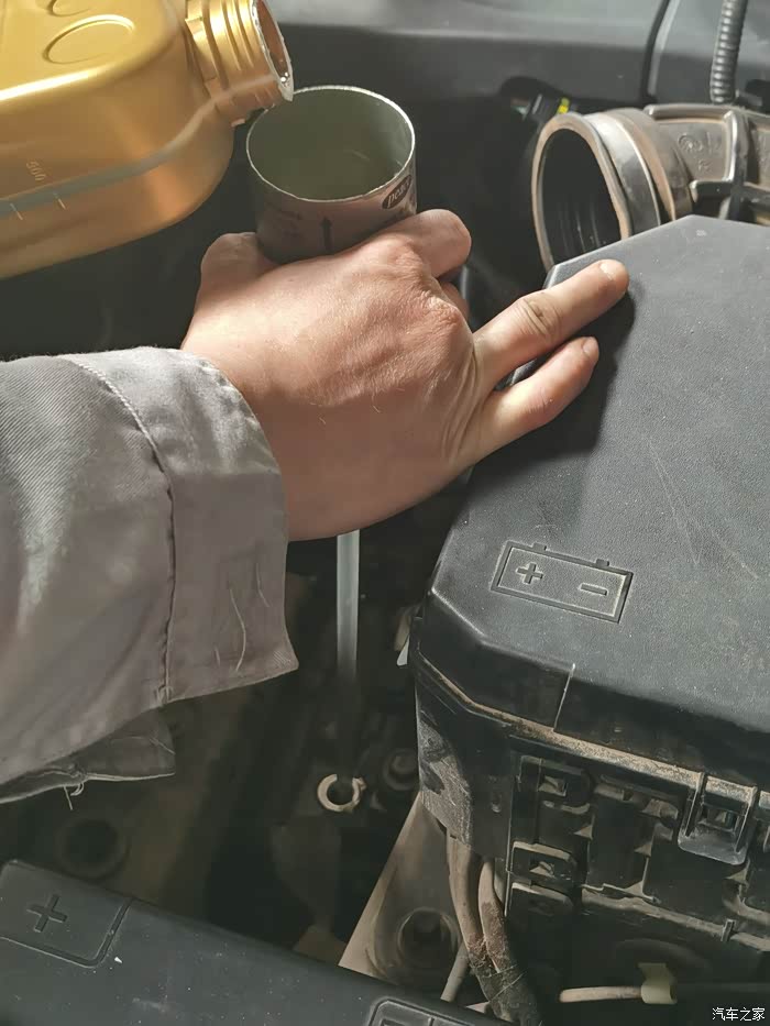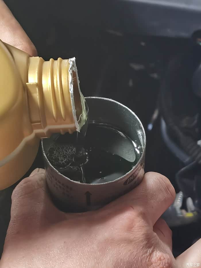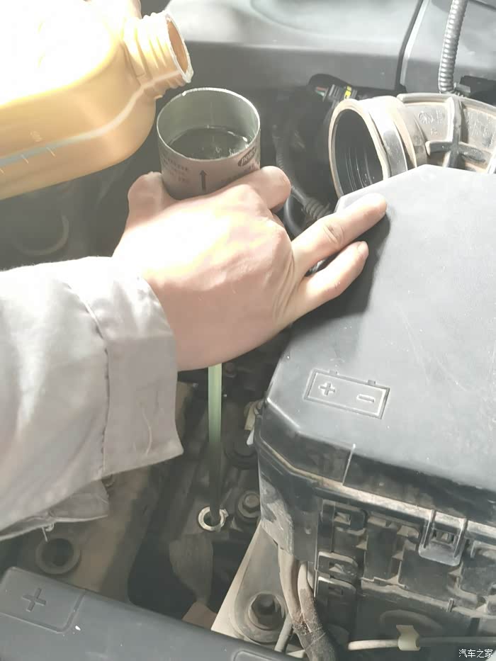 长漏斗注入新油,先把油拧开,一个人可能不好操作