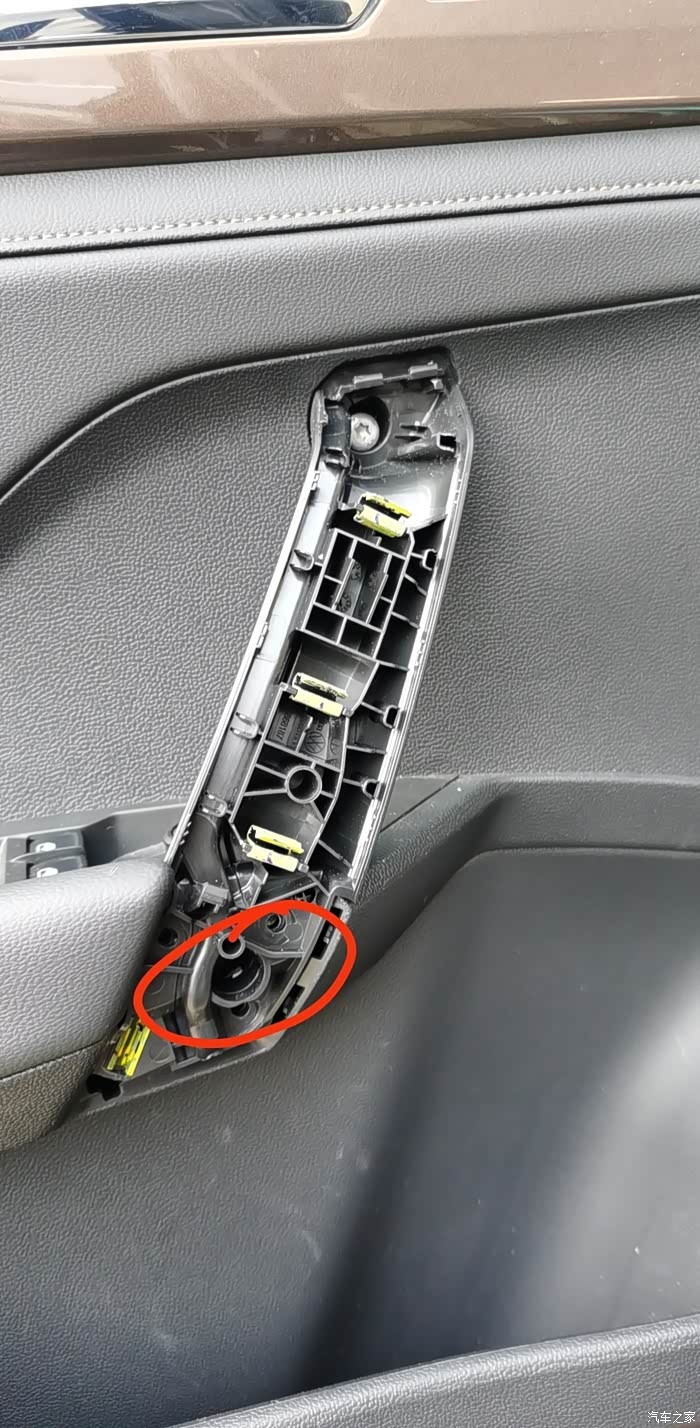 提醒各位改装朋友,左侧车门把手的下部螺丝(上图画红圈的位置)需要拆除车门窗控制面板后才能卸下来。