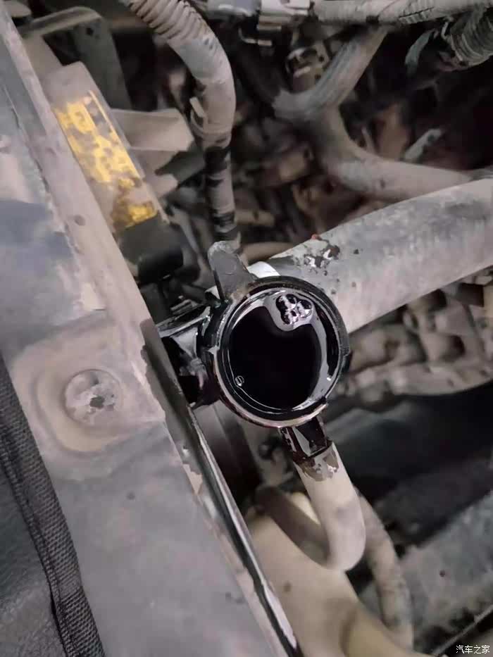 拧开水箱盖儿,为了一会儿排放防冻液更方便。