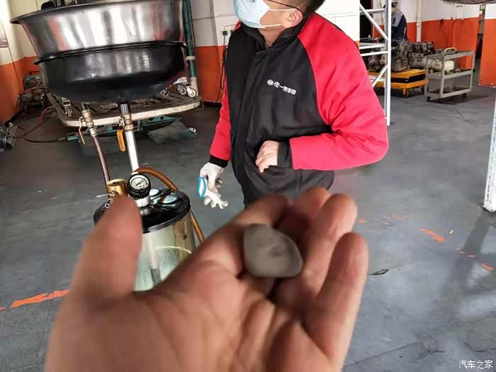 师傅检查底盘,发现底盘上夹了一个鹅卵石。