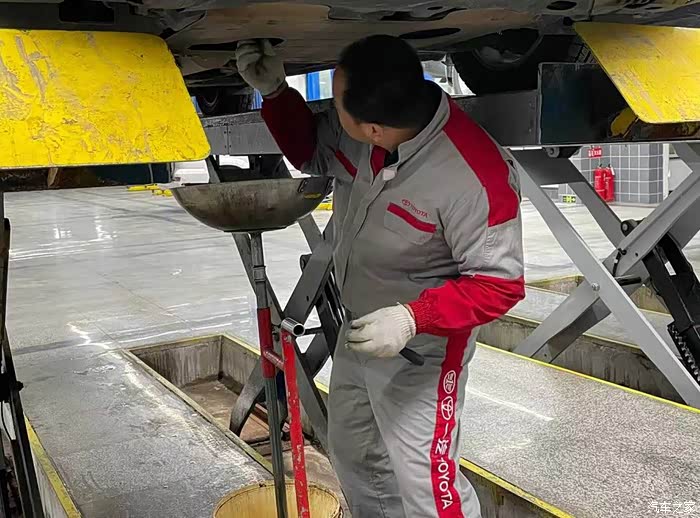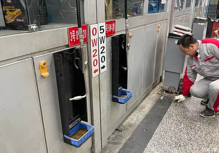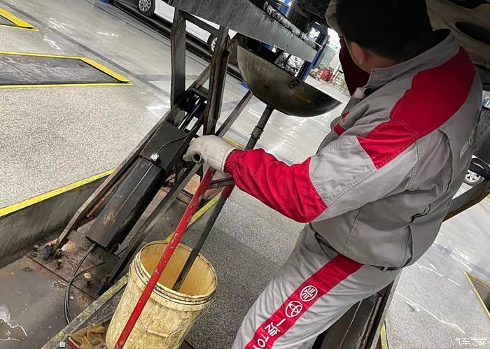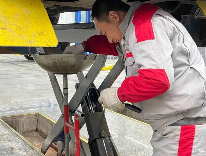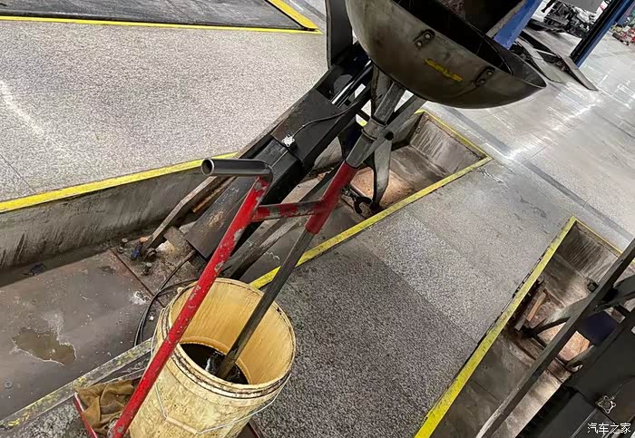 在我不经意间,车已经被高高地升起,师傅在拿工具正弄着什么,我不太了解只是看着,师傅很风趣幽默,我也请教了他几个问题,不一会机油从里面流出来了