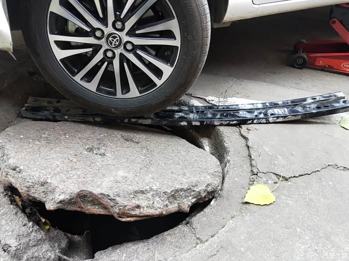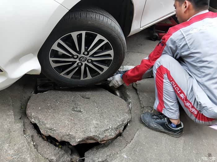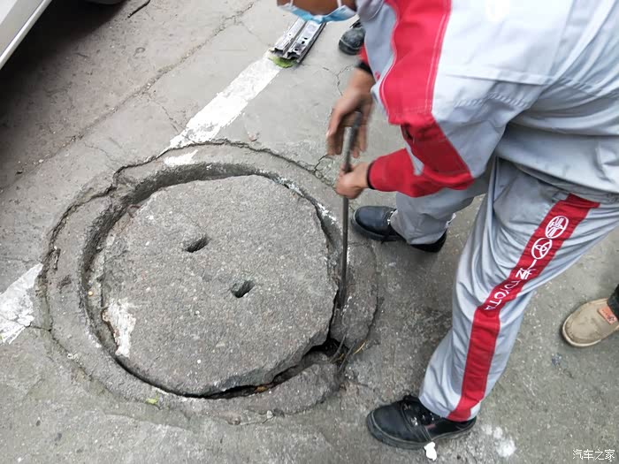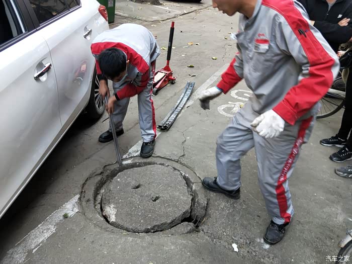 不过因为左前轮儿掉进下水道了,所以左侧车身变低,千斤顶也不好塞进去。