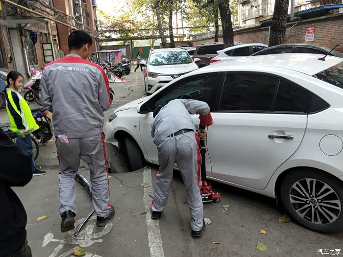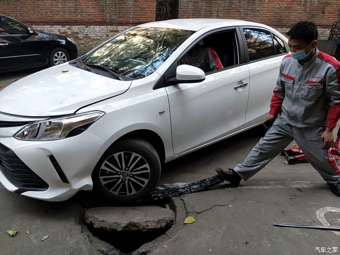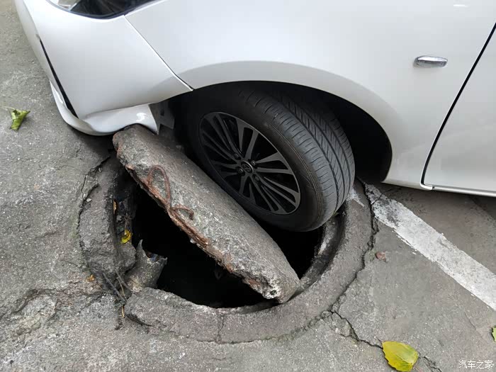 中午的时候留亲戚在家里一起吃了个饭,下午走的时候没想到亲戚的威驰车碾压到下水道盖,把以前那种很厚并且破旧的下水道盖推到一遍了,就这样左前轮儿一下子就倒进掉进下水道口里,并且保险杠也弄变形了。开始的时候想着挂上档加点油门能出来,但是车轮一直打滑根本出不来,后来几个人一起抬,没想到威驰这个车还挺沉的,最后也是失败告终。