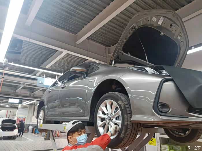 我在店里转了一圈出来的时候,车子已经被架起来了,看样子应该正在进行中,跟着师傅也学习一下吧。
