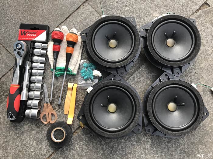 导致两个非常明显的问题——频响残缺(整体声音发闷人声干涩)声场怪异(声音只从车厢两侧底部发出)。作为一个穷烧音响十几年的老司机基于缺啥补啥和不瞎折腾的原则立马动手。上周加装了两个丰田拆车的丝膜高音(直接卡上去那种)。整体声音得到明显改善剩下人声干涩还有低音松散需要改善。本周继续动手更换四门喇叭过程不啰嗦了。
