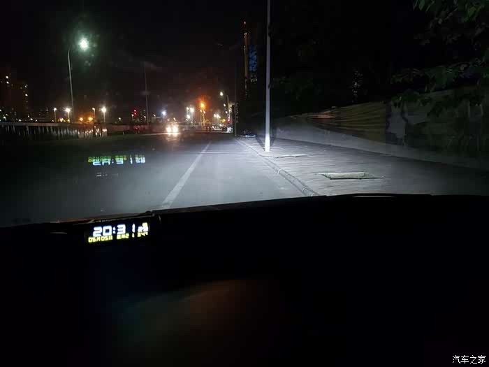 晚上试车,这是对面看,完全不刺眼,因为雾灯很低。这里大家注意,地面非常清晰,这是氙气灯的优势所在,后面还要讲到。