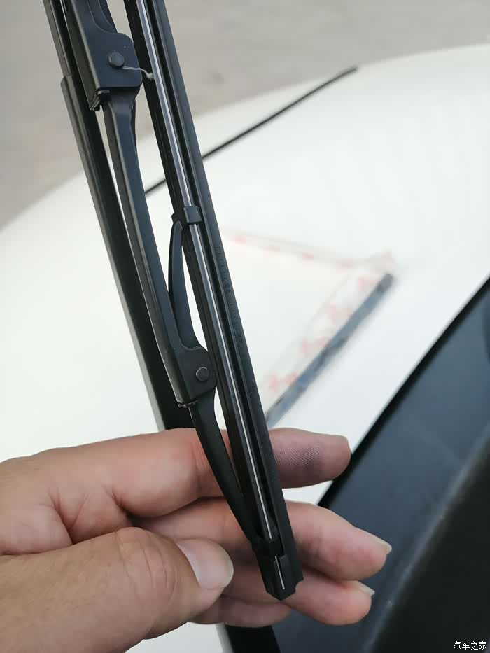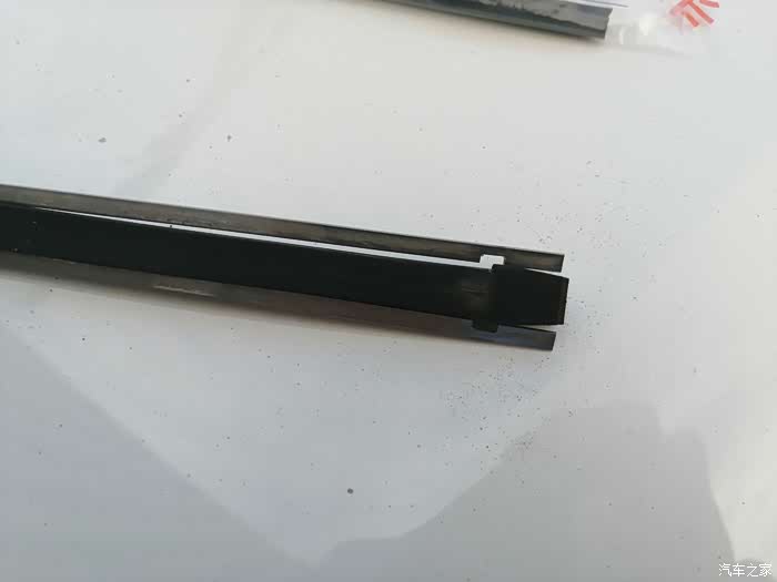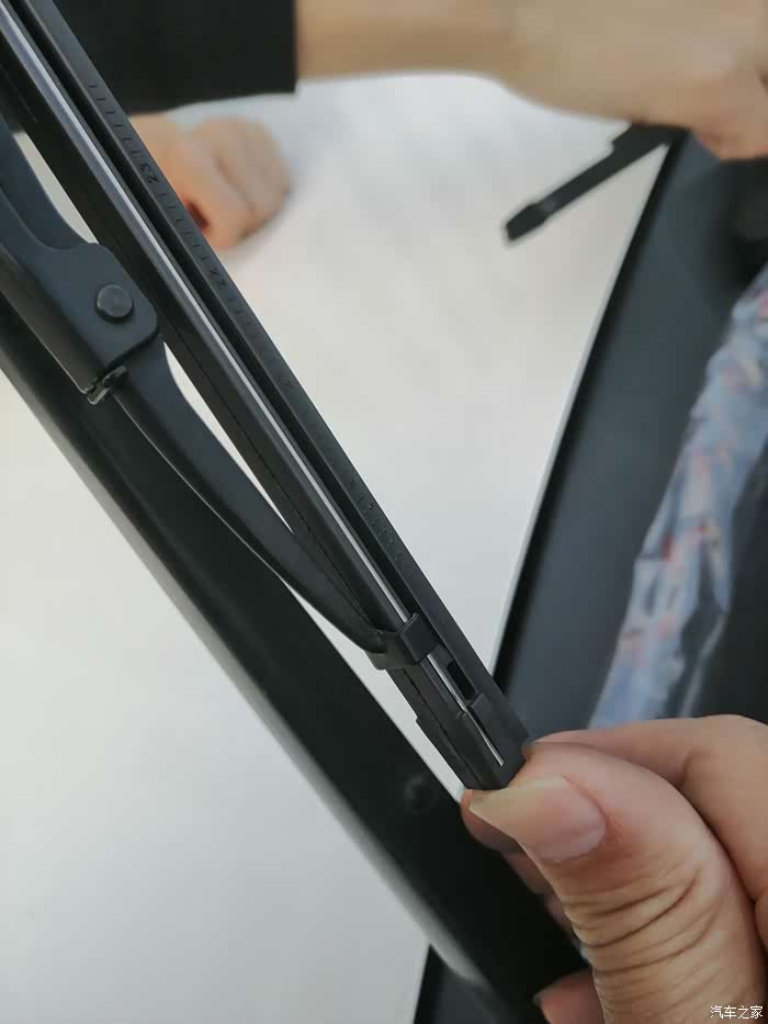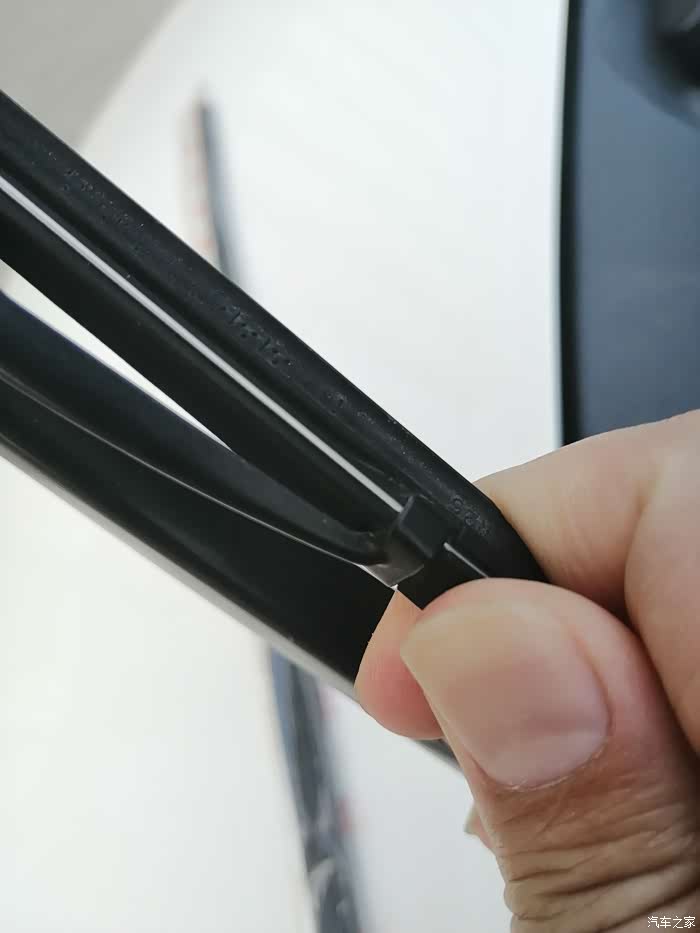 在雨刷胶条的最下端,会发现有个U型卡子卡在胶条的凹槽内。一手抓住雨刷器,一手捏住胶条底端,往下拔就行,悠着劲儿,别太野蛮,很容易就能拔出来了。