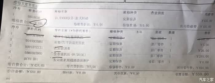 本次保养费用,共计451元。燃油系统没做去掉了,首保免费送的燃油系统清洗剂还没用,过一阵用上。