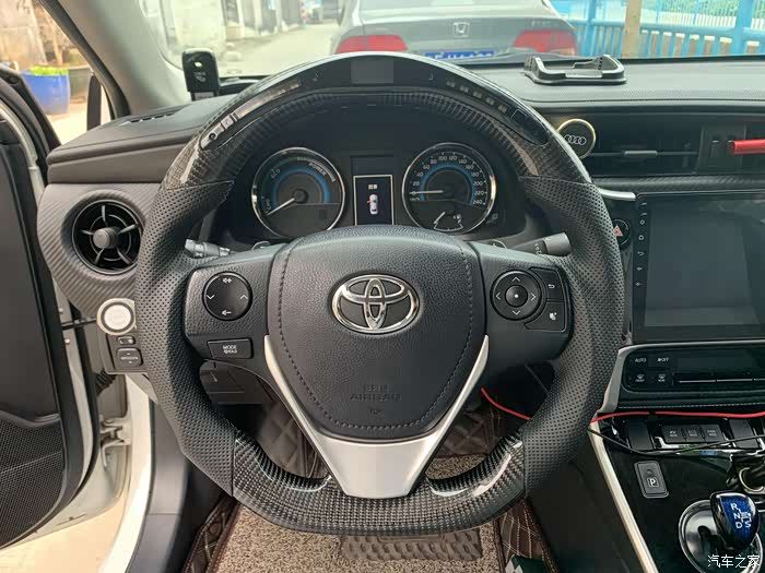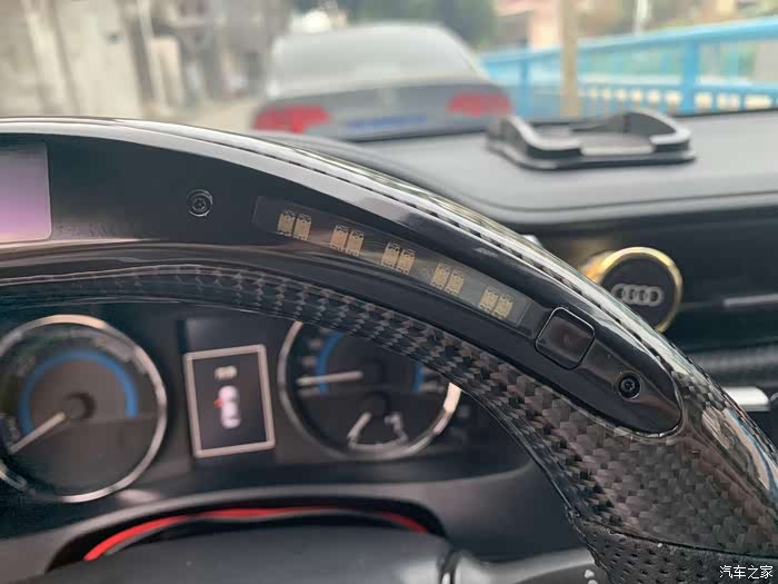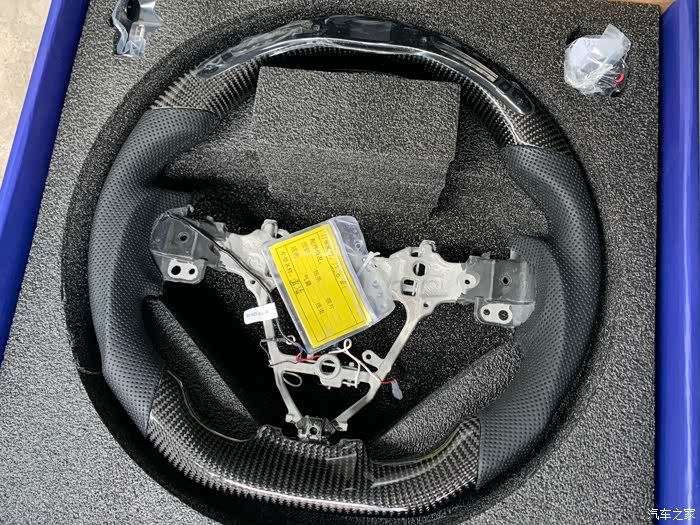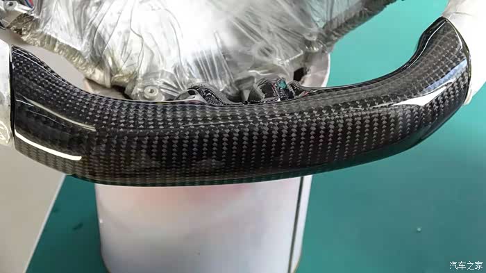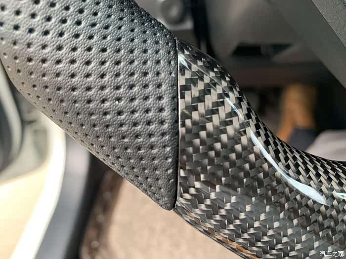 方向盘九点和三点位置是真皮打孔包裹的,十二点和六点位置是碳纤维包裹。