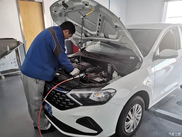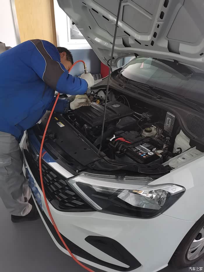 开始保养前,师傅先用气枪清理了一下发动机舱内的灰尘,之后用布给擦的干干净净