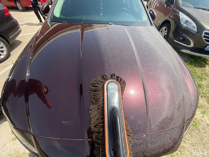 再从前面看看擦完的前机盖和侧身的对比,因为毛巾有限,只能借用汽车掸子先掸下灰尘再喷洗车液了