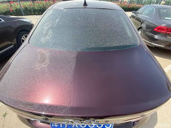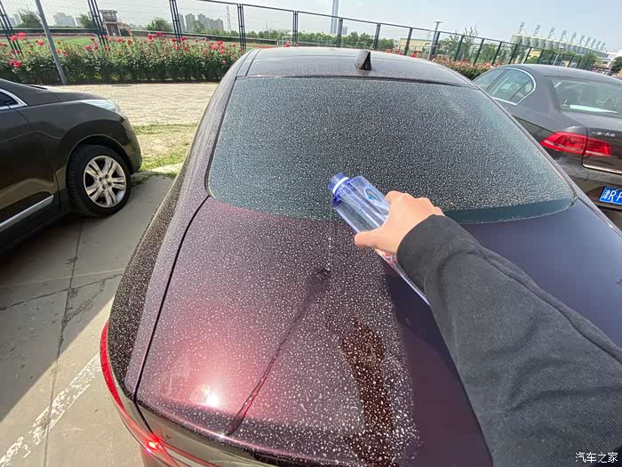 再来个矿泉水试试吧,能不能和洗车液较量一下,大家可以看到,矿泉水在车漆上没怎么停留,那是因为我镀晶的缘故,不是泥雨的造成的