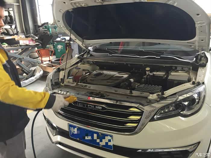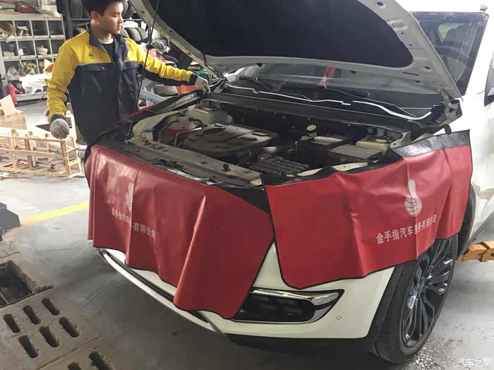 维修师傅把机舱打开,各个方位都垫了防护垫子,举升机把车子升起来开始放机油。
