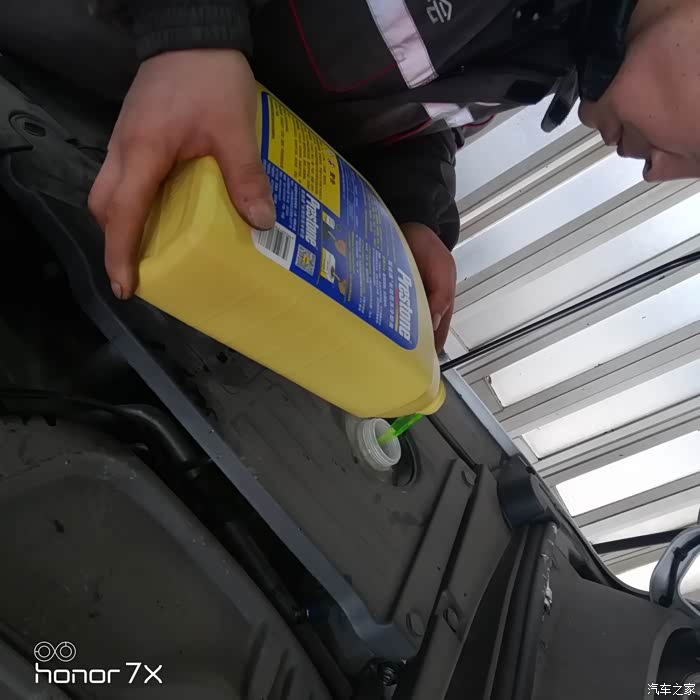 排空后,师傅开始加液。翠绿翠绿的液体看得我竟然有了胃口。哈哈!这可是缤越的心脏保护剂,不为别的,就为车子更好开。操作非常小心翼翼,还不时给我解释情况,真得不错。