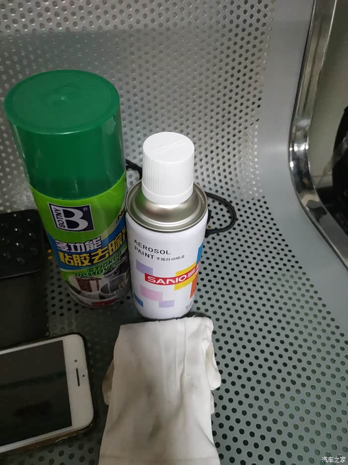 准备好简单的修复工具,胶痕去除剂加白色专用喷漆,还有手套抹布等