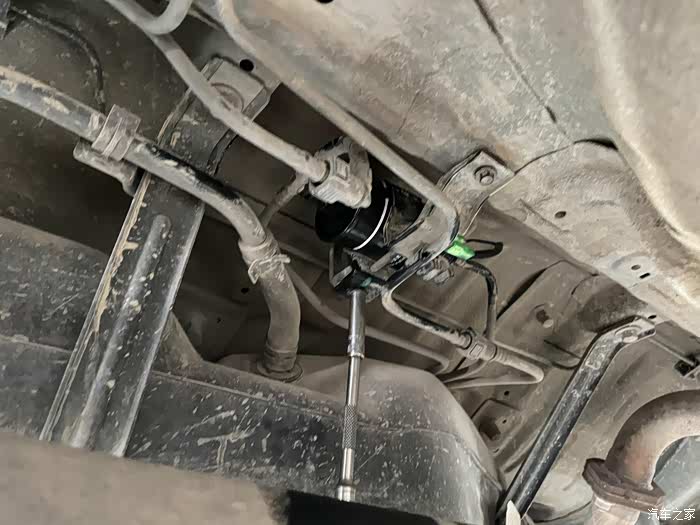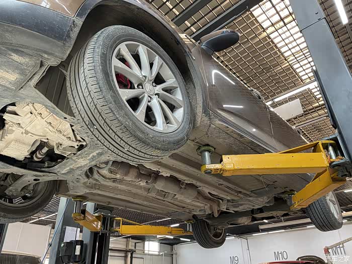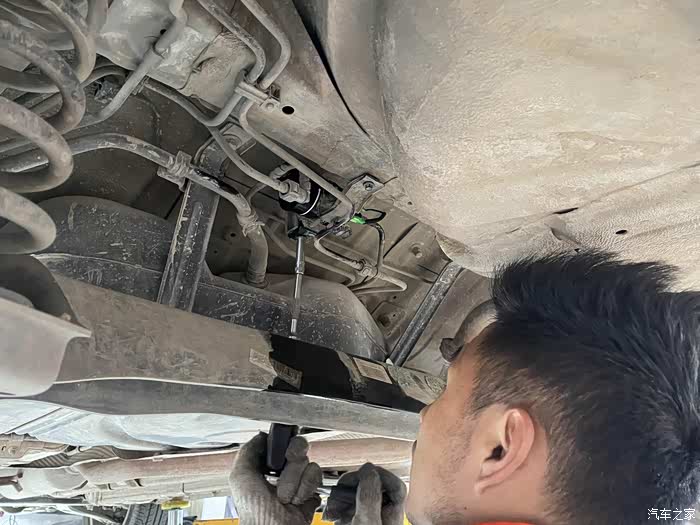 进工位后,先进行汽滤的更换,车辆被抬起来。请忽略底盘的泥土,因为昨天是清明,去上坟,加之我们这里在下雪,所以底盘被泥土给糊满了~~~