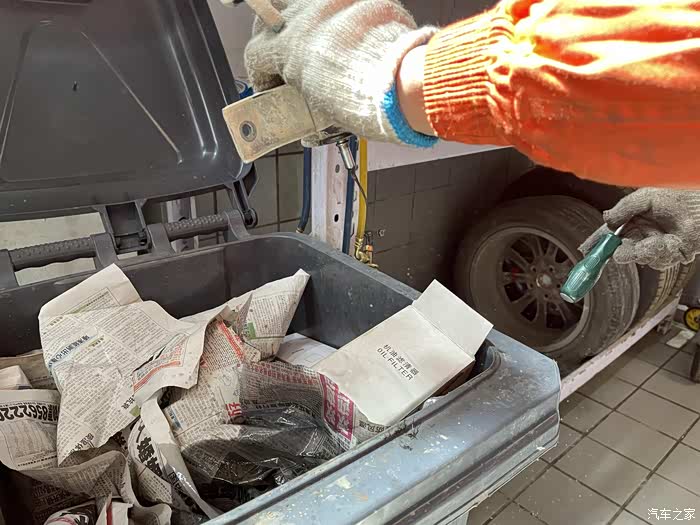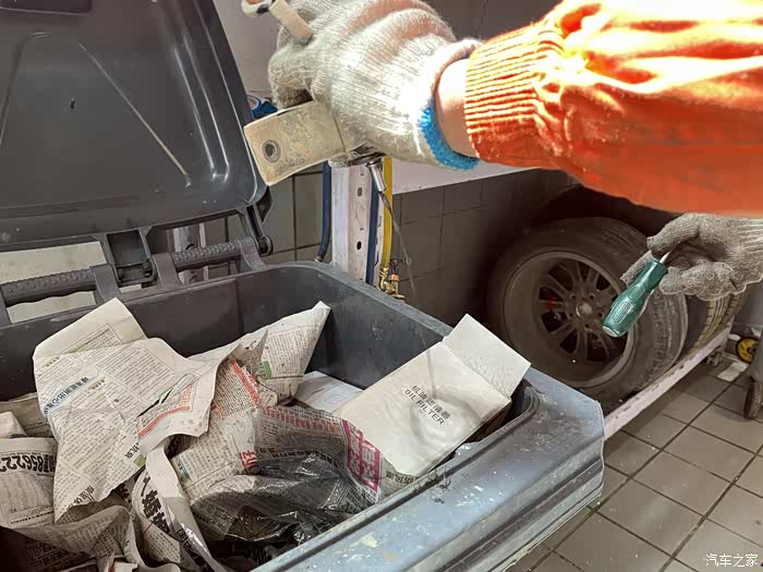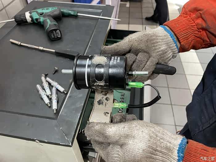 这是被拆除下来的汽滤,按照规定每一年或者3万公里就应该更换,由于自己平常自己保养和加油的习惯比较好,所以一直没有更换。为了能让车友们观看的更直观,我特意让维修师傅把汽滤中的汽油倒一下,并且用工具敲打一下,让汽滤中的杂质流出来让大家看一下。