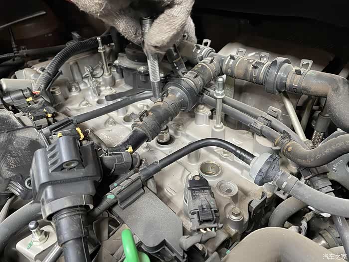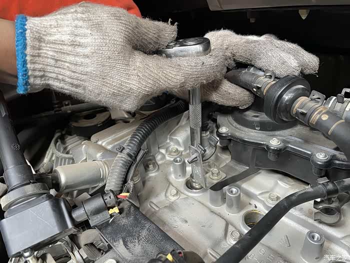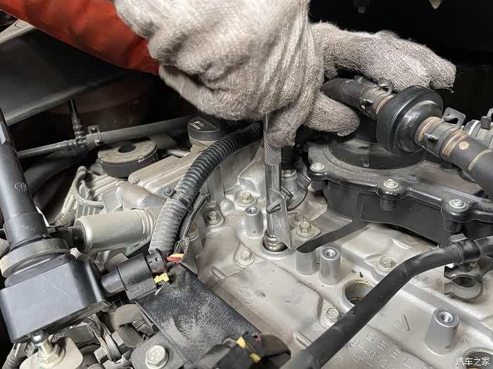 先拆去四缸的点火线圈,用套筒将火花塞一一旋出。