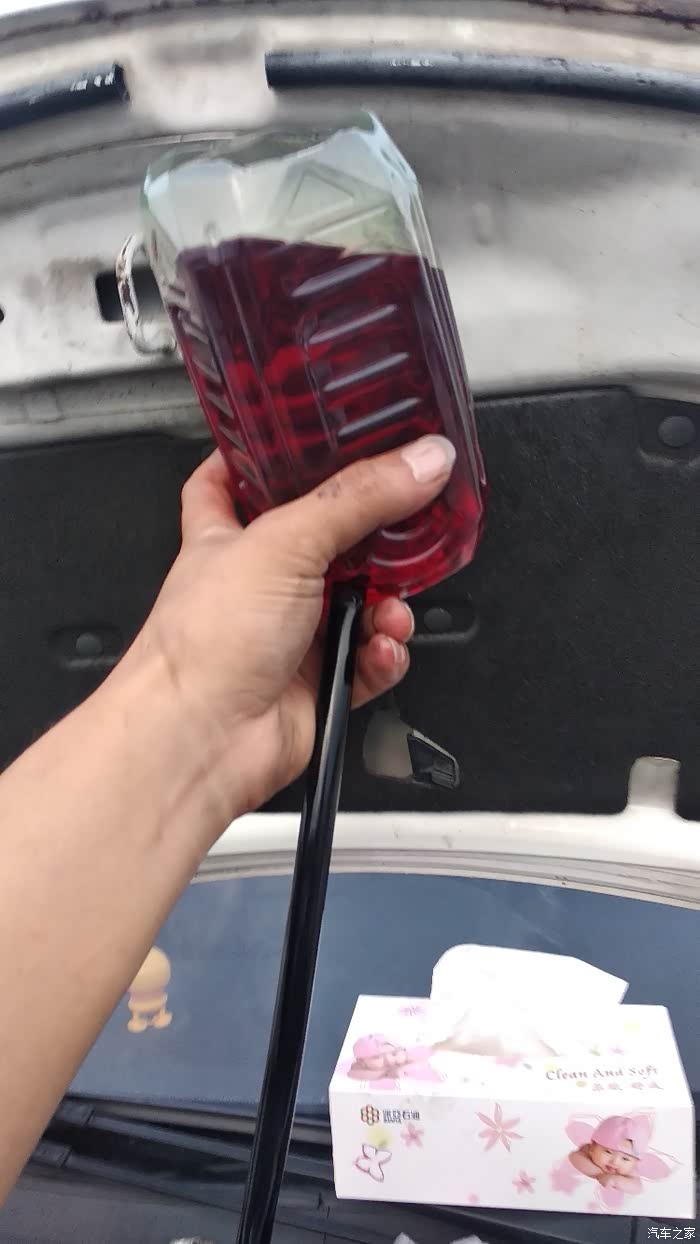 先加三罐油,漏斗先不拆,等下还要加油,然后把刚刚拔下来的散热进油管口用瓶子接住,因为散热器里面还有2.5升旧油要喷出来,这样换的油可以达到百分之95了。