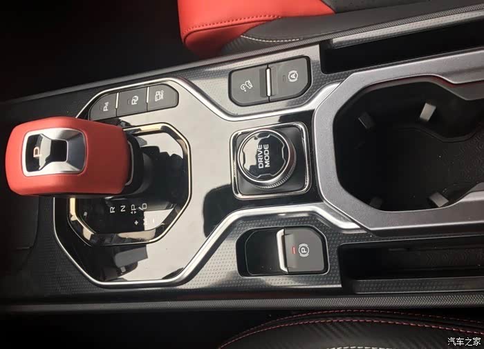 档杆的握感很舒服,后方有驾驶模式选择旋钮。杯架比较深,两侧有放手机和卡槽的空间,中央扶手深度也比较深,我试了一下,放瓶水完全没问题。