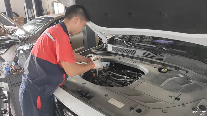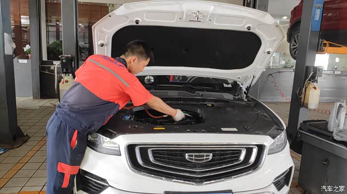 取下发动机上面的盖板,然后就是拆卸机油滤芯了。要不是看师傅保养,我还以为博越的机油滤芯跟其它车型一样,都是在发动机的下面呢。虽然把机油滤芯设计在上面,拆卸起来比较容易,但是放机油的时候,还是要在下面进行。