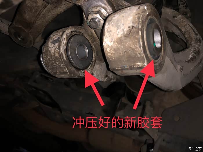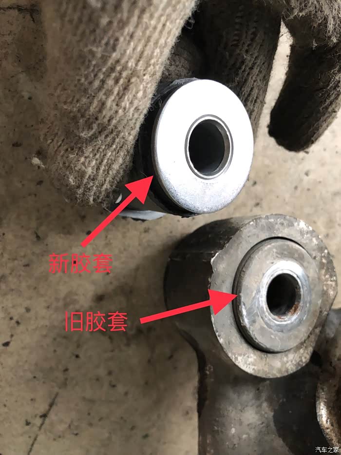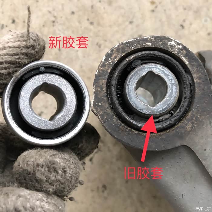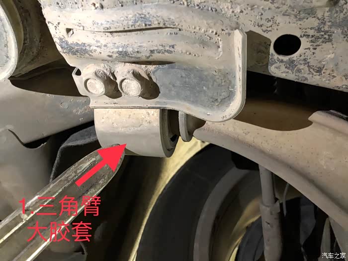 延保结束后发现车过减速带减震和通过U形地面时经常出现底盘咯吱咯吱声,颠簸路面的时候感觉底盘松散,去4s店试车的时候因为路面好、车速低又试不出来问题;后来看到论坛里的 姑苏慕容雪 大神关于XTS的问题及解决方案,请教了修车的高手,将XTS进行了详细检查后发现原来是下摆臂(三角臂)和减震下托架(叉臂)的胶套老化导致的。