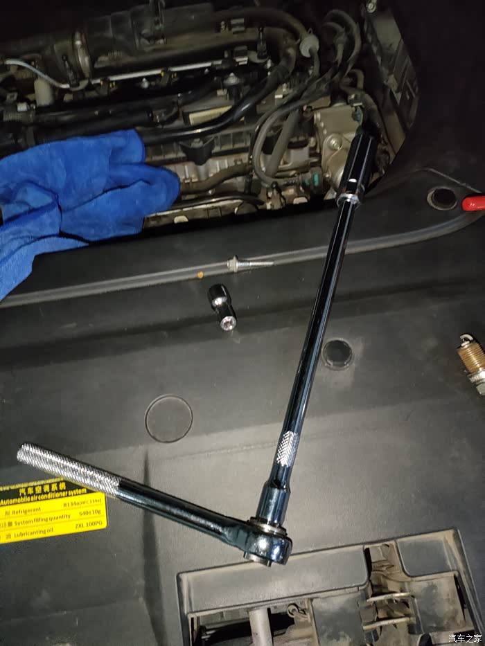 主要工具16mm的火花塞套筒扳手和8mm的六角扳手,这个红色的套筒扳手是买火花塞送的,虽说是专用的,但是短了,不够力,幸好我准备充分。