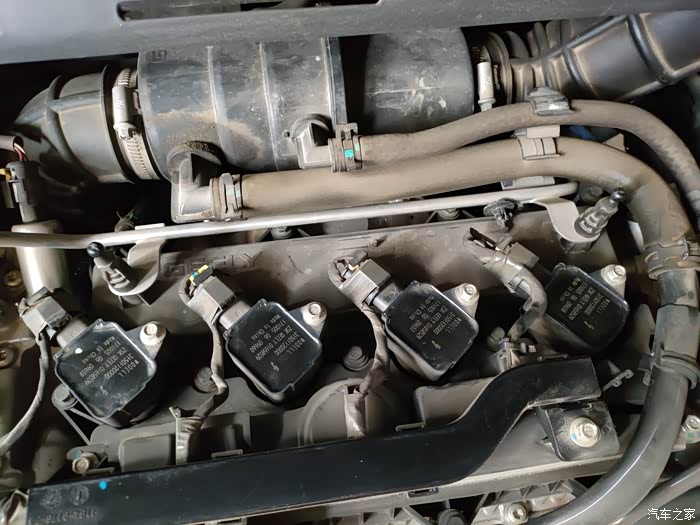 拿开隔音棉,4个点火线圈就看到了,整齐的排在发动机上面。
