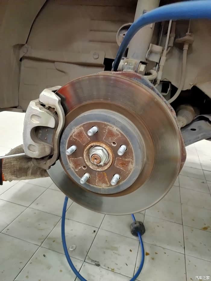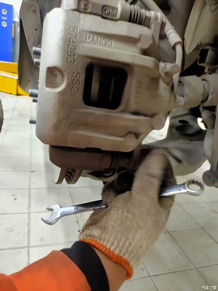 话不多说,前段时间开车总感觉刹车没以前灵敏,每次踩的深度较比以前更深一点,作为老司机的我第一感觉就是刹车片磨损到临界点了,因为刹车油经常检查,可以确保没问题。开车到店,经工作人员检查确认,刹车片确实该换了,二话不说,换!上架子,卸轮胎,在这特别说下,博越的轮胎在卸的时候要先把轮胎螺丝上的防尘罩给拆掉,它的作用继续相当于轮胎罩。下边图片会有。卸掉轮胎后会看到明光发亮的刹车盘,在卡钳的背面,有个螺丝,松掉之后就可以把卡钳给掀起来了,然后拿掉旧的刹车片,装上新的,卡好位置,盖好卡钳,在拧紧螺丝就可以了。