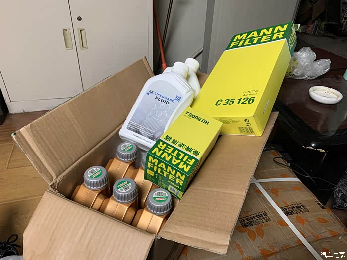 材料都在这里啦,因为发动机和变速箱都是重力换油,所以需要准备8L机油和6L变速箱油。