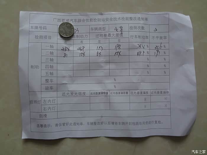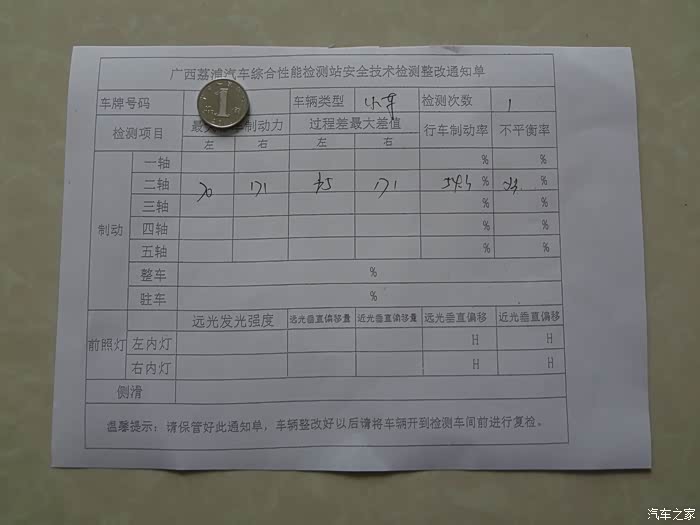 分泵倒是没有问题。估计是去年更换刹车片时,修理工没有安装正确。店老板将那片刹车片打磨后重新装了上去。启动车子,轻轻一点刹车,左后轮就刹住了。但在路面上进行了几次急刹车,唯独左后轮没有留下刹车痕迹。店老板建议使用几天再去年检,磨一磨。但有人约我同去,准备第二天再去。3月18号第二次上线检车,还是相同的问题,没过。但同事的车,只是由于下雨,没有清洗,大灯亮度不够,第一次没过,清洗后,再次上线,过了!