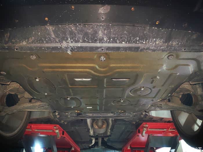 曾经因为视线盲区底盘磕到过一次小矮墩,后来在网上看到了一款3D铝镁合金制的专用开模的发动机下护板,就买来装上了。这个底板还贴心地预留了可拆卸的保养口,所以做基础保养的时候很方便,只要转掉几个螺丝就好了。