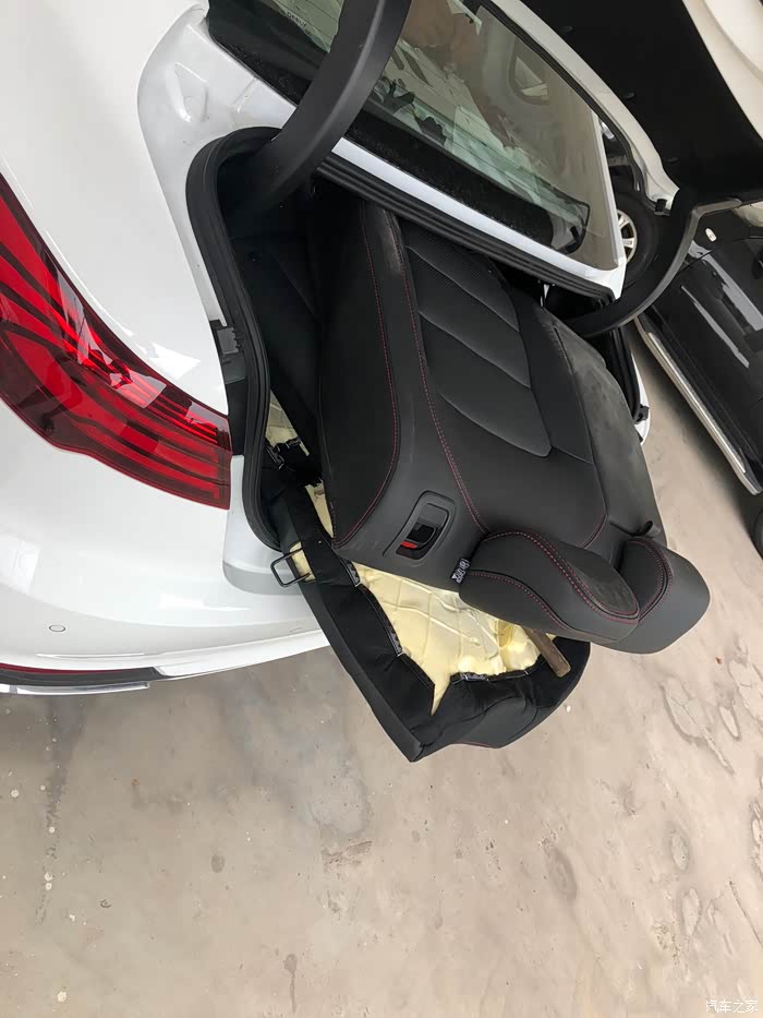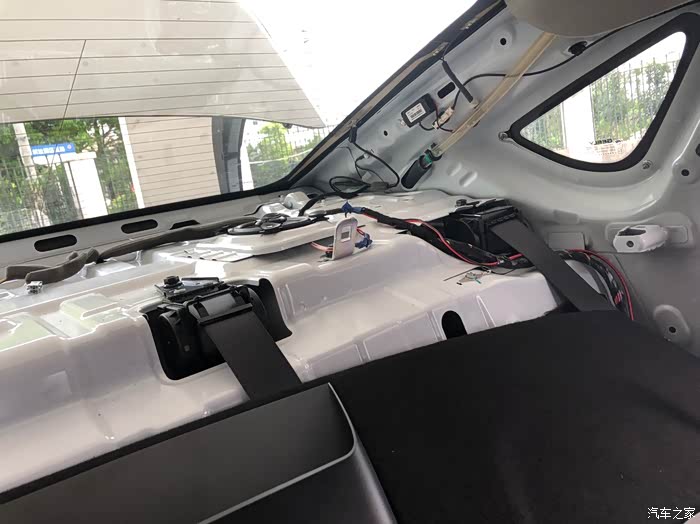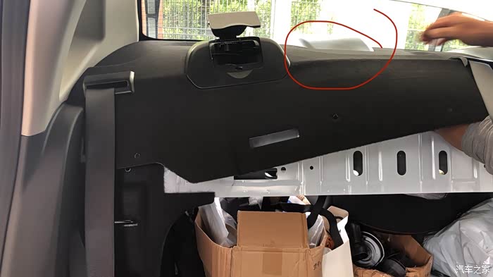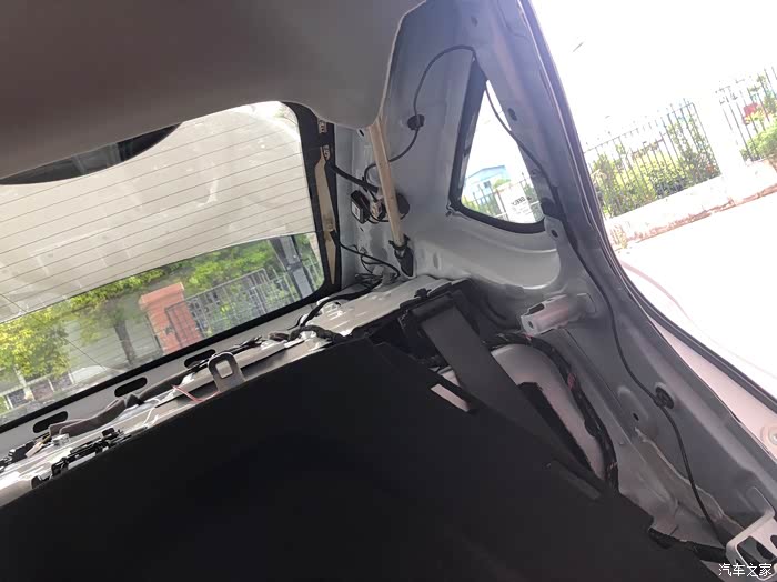 5.两侧拆下后开始拆黑色盖板,这一步要先从后备箱里看,会有一个白色的卡扣,向上面敲就行。然后盖板要先掀起来,把刹车灯和后备箱车灯接口线拆掉才能继续下一步,线解决后盖板向前排拉就可以拿掉了。