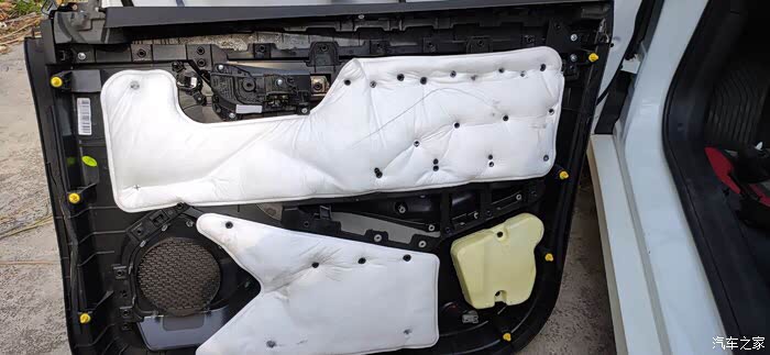 这个是拆掉门板后的车门整体,出厂就是一层防水膜,没有什么隔音效果可言,车门边沿那些小孔就是对应门板那些黄色扣子的。