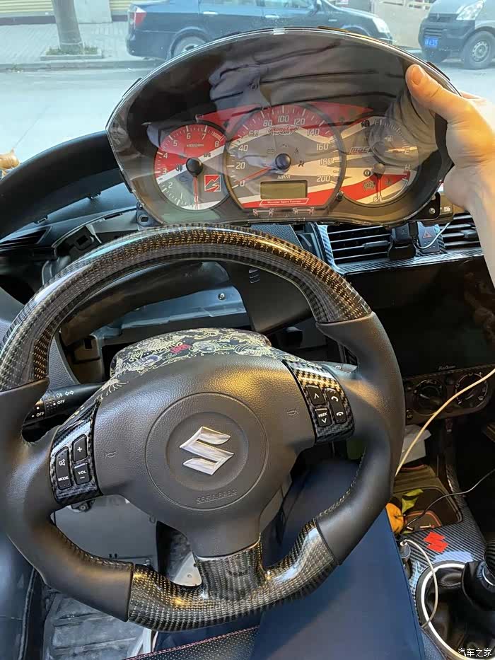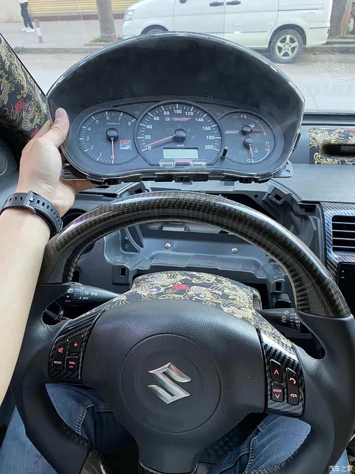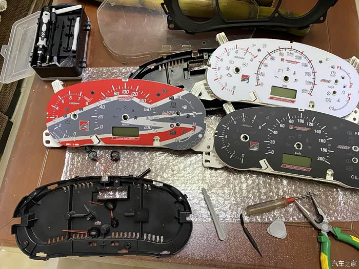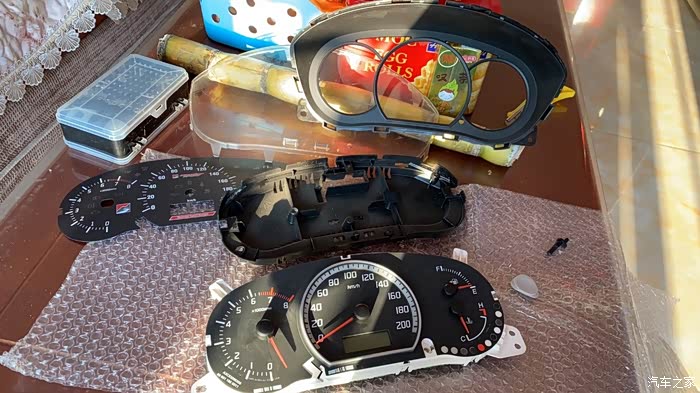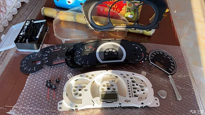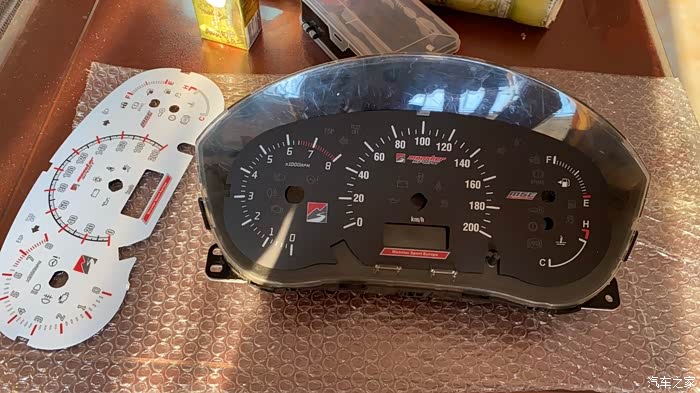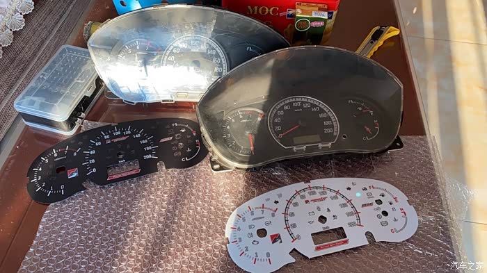 大概半个月前已经买好了两个拆车仪表,准备着如果拆坏了还有零件替换,果然,真弄坏了中间的时速指针马达。拆倒是简单,主要是装,装指针要用柔力,我这种手残弄几次都弄不好还弄坏马达。,黑白两张表纸也弄破了。好在红色的山水画没事。拆嘛,后壳有大概6个卡扣,指甲都能一个个翘起来,很容易开。然后拔指针,虽然是大力出奇迹,但也不能太粗暴。然后就可以拿掉原车表纸了把MSE表纸放上去以后,先到车里插上插头,等马达回位之后再装指针。