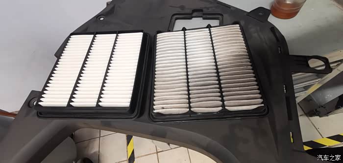 这个是新滤清器和使用近1万公里的空气滤清器的比较,
