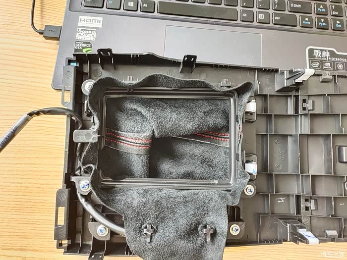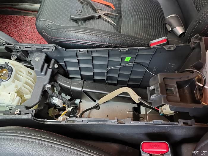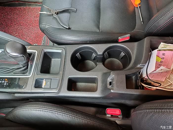 先把水杯架拆下来,没有螺丝,大胆撬就是了,撬开后把电子手刹开关的插头拔下来。