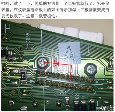结合论坛的图片这样并联两个1N4007二极管,负极并联,负极并联那一端接插头仪表灯线,正极那一端接仪表灯配线端,另一正极端并接插头端仪表盘电源线