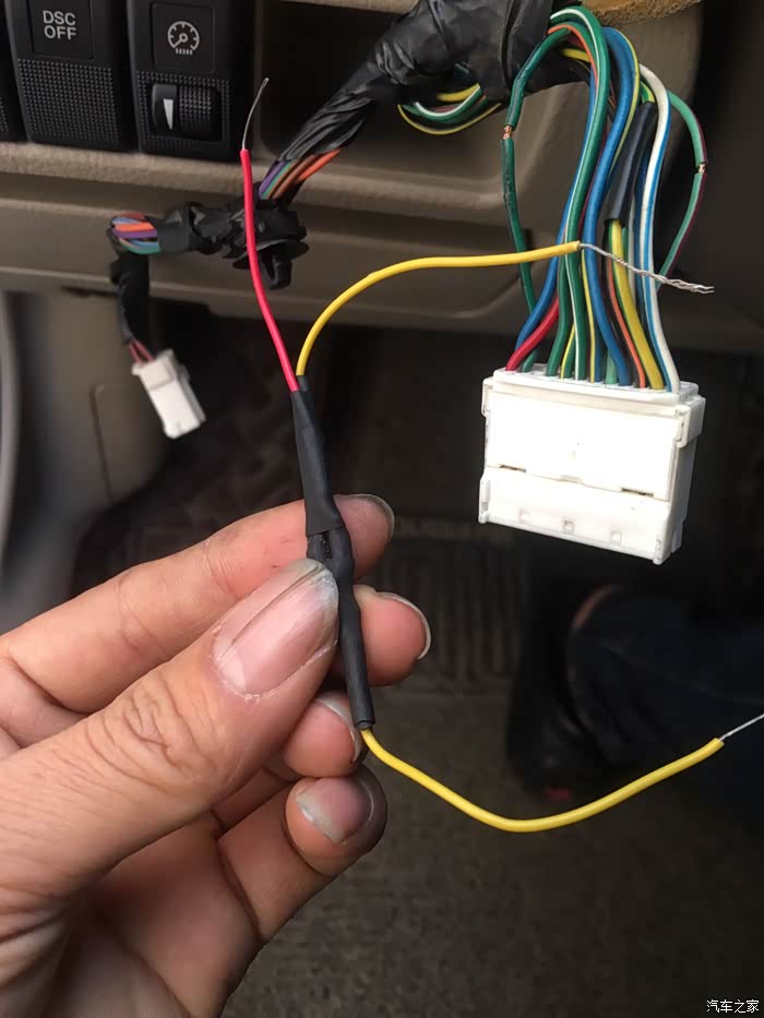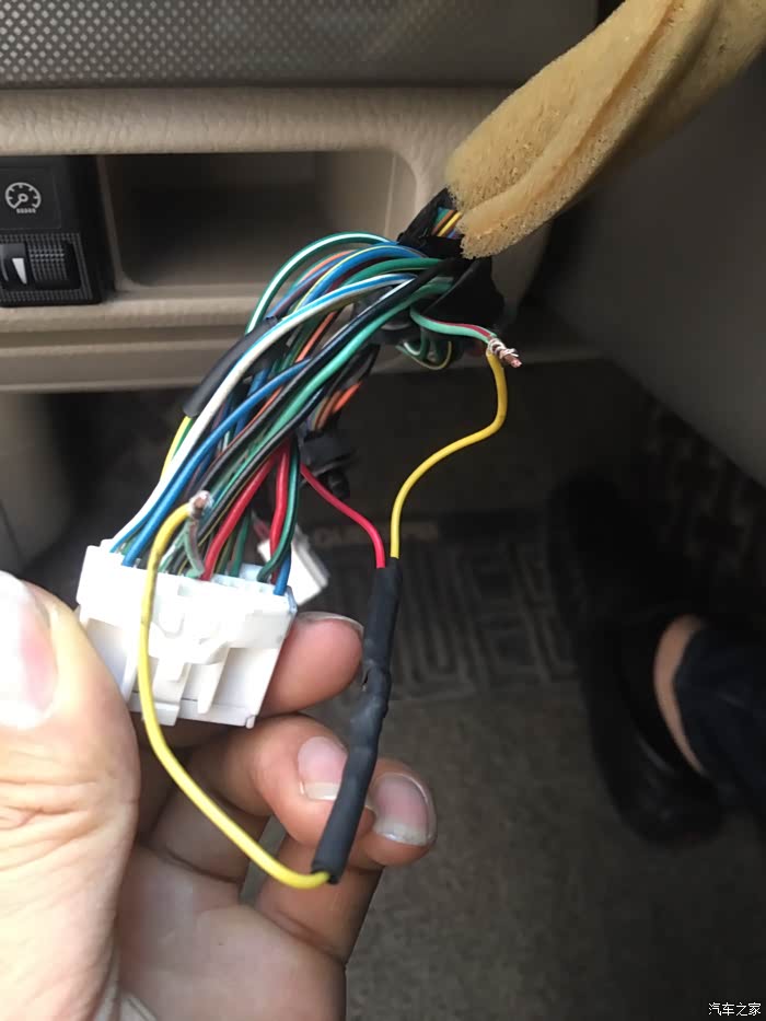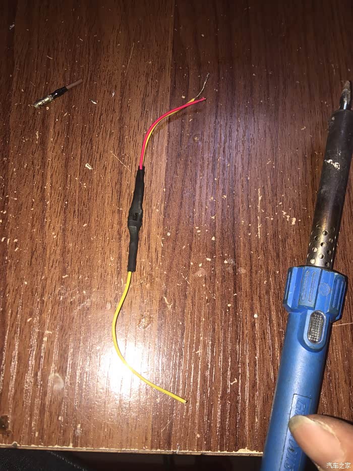红色线接刚才测量好的仪表盘电源线,黄色负极端接仪表灯插头端,黄色正极端接仪表灯配线端(仪表灯线剪断了)