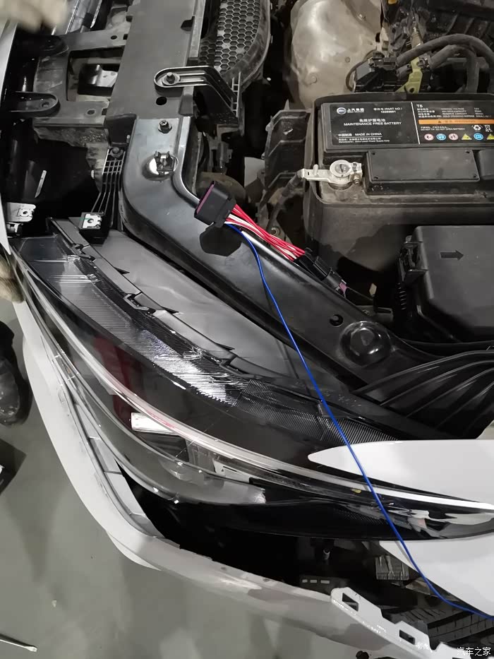 师傅还在装前保险杠,这边已经测试成功了,成功电亮,只有点火后才能点亮日行灯,转向灯打开,自动从高亮变成低亮,打开示廓灯,前日行灯变成低亮。