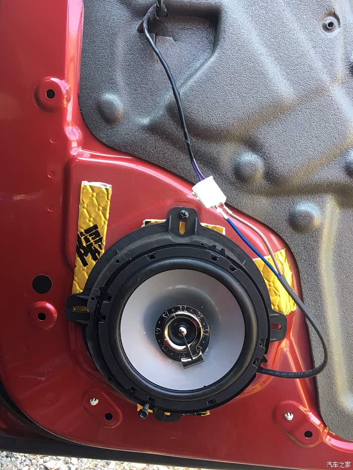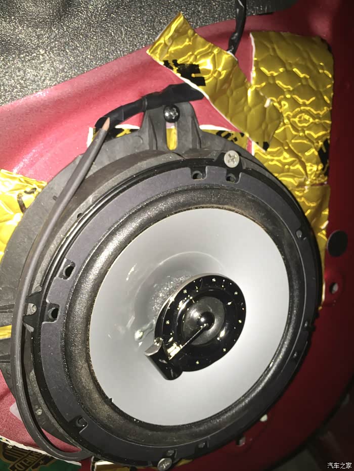 因为喇叭小,虽然配套了喇叭垫子,但是孔位有点不对、只能上到2颗螺丝,我就用止震板做了固定,挺牢固的