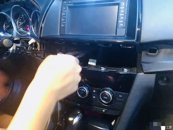 先把一键启动那边的仪表板翘开方便右侧的长条仪表板出来,慢慢的把长条仪表饰板翘出来。导航面板拿掉后用十字螺丝刀和十号长套筒或丁字杠卸下来。
