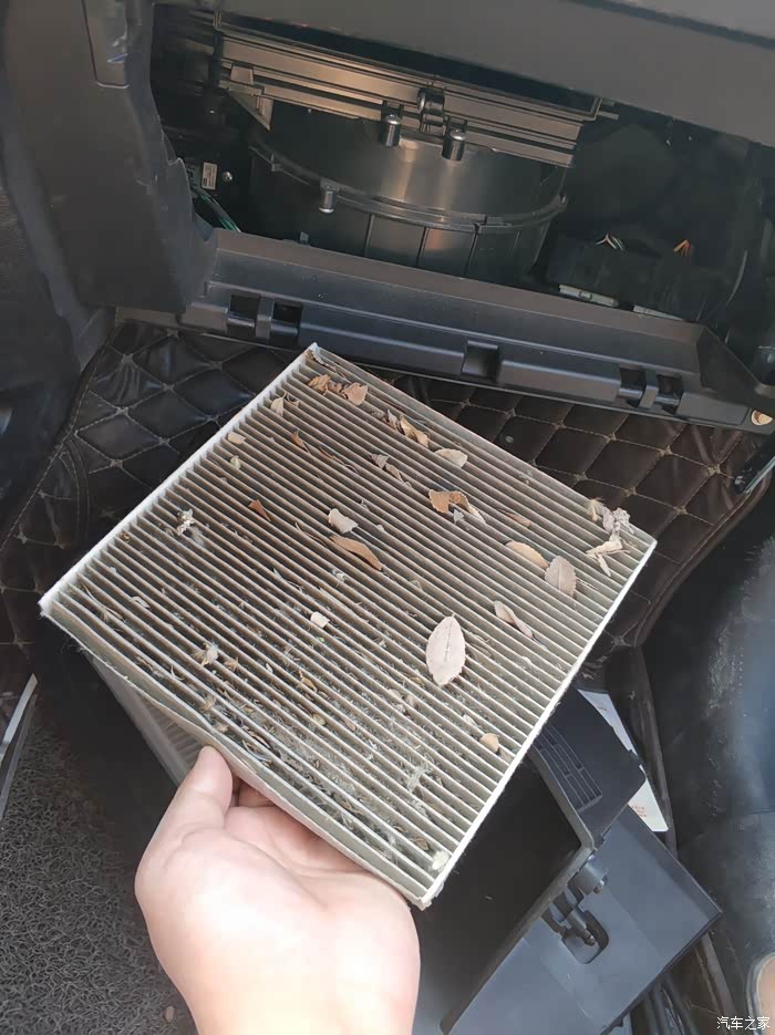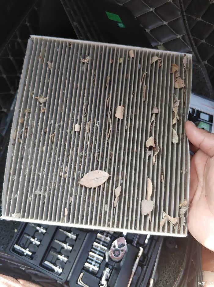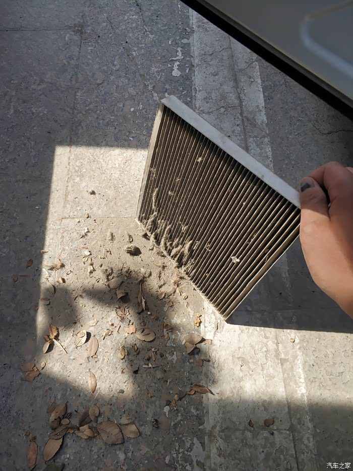 惊喜在这里,拿到车外磕了一下,灰尘漫天飞舞哈哈。树叶 、灰尘、飞毛啥的挺多的,貌似是去年扣了一次保养该换滤芯了木有换,最少一年或者一年半啦。